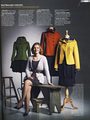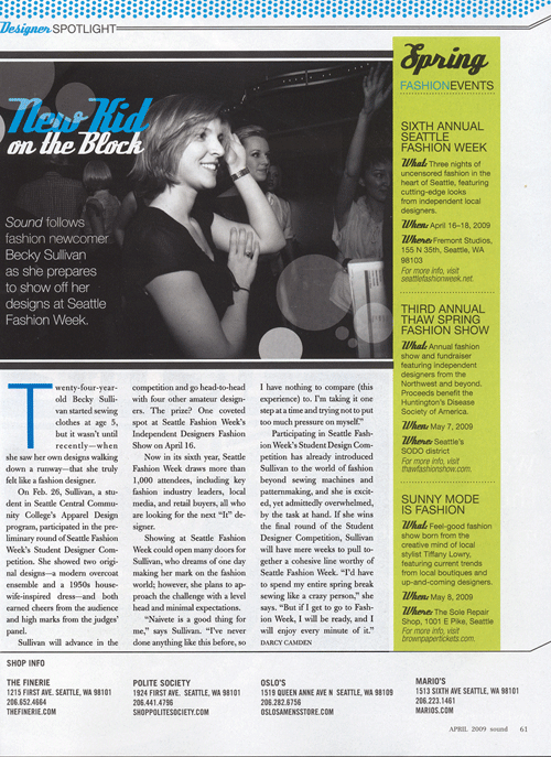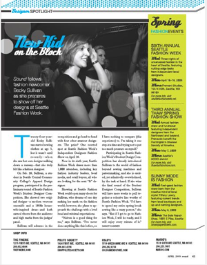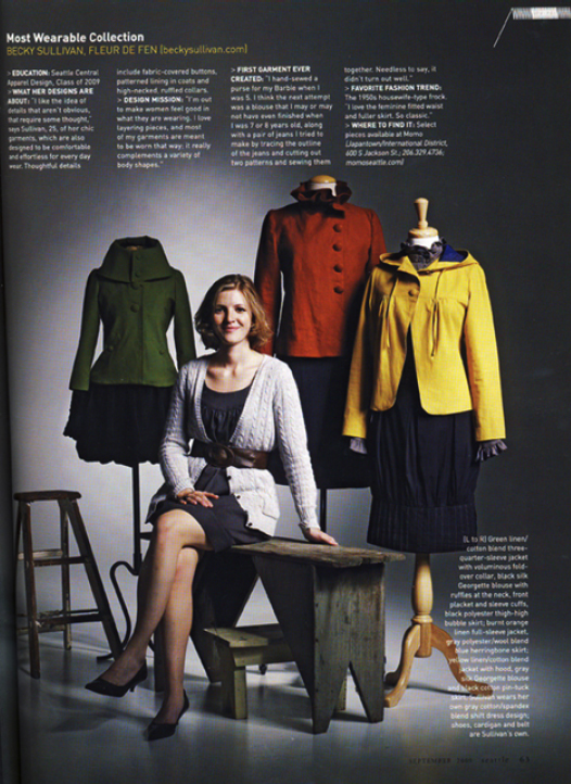 "Participating in Seattle Fashion Week's Student Design Competition has already introduced Sullivan to the world of fashion beyond sewing machines and patternmaking, and she is excited, yet admittedly overwhelmed, by the task at hand. If she wins the final round of the Student Designer Competition, Sullivan will have mere weeks to pull together a cohesive line worthy of Seattle Fashion Week. "
